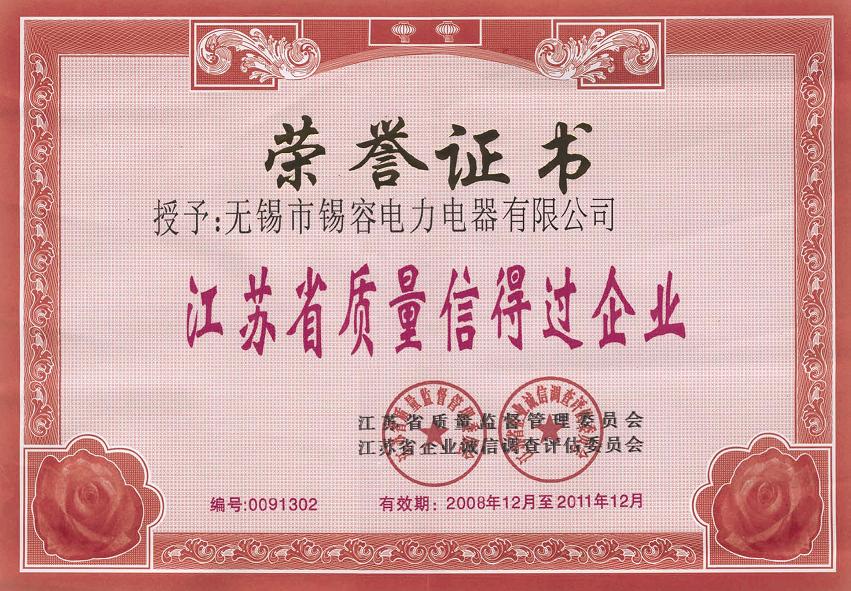 2008年江蘇省質量監督管理委員會、江蘇省企業誠信調查評估委員會,授予無錫市錫容電力電器有限公司 “江蘇省信得過企業”榮譽證書